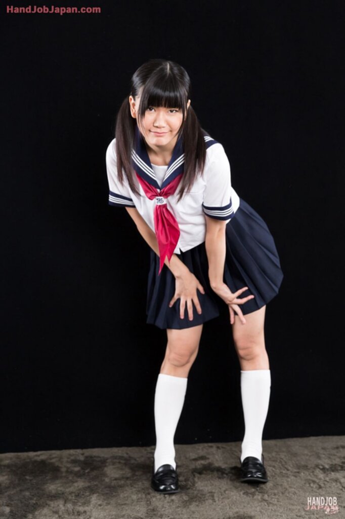 Kogal in uniform hair in pigtails leaning forward hands on her knees